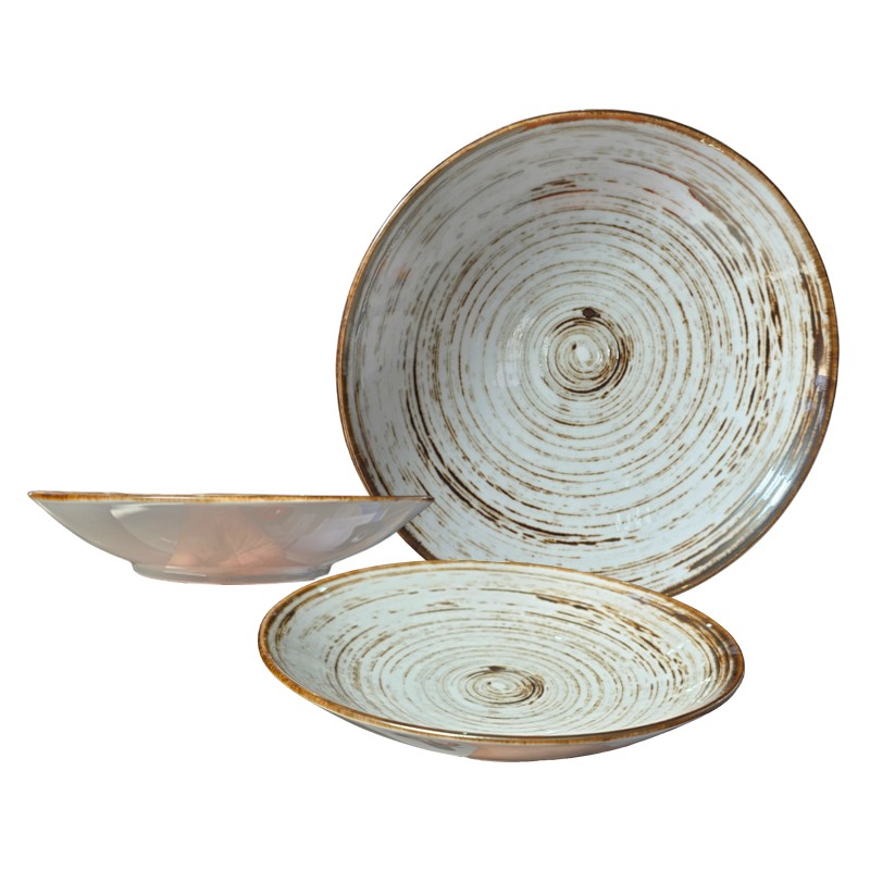 Il colore bianco tendente al crema, arricchito da un bordo marrone e da un motivo a spirale marrone concentrico al centro, dona un effetto elegante e particolare, perfetto per valorizzare ogni pietanza.
