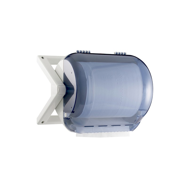 Realizzato in plastica ultra resistente, questo portarotolo coperto è dotato di coperchio blu/trasparente che permette di controllare lo stato del rotolo.