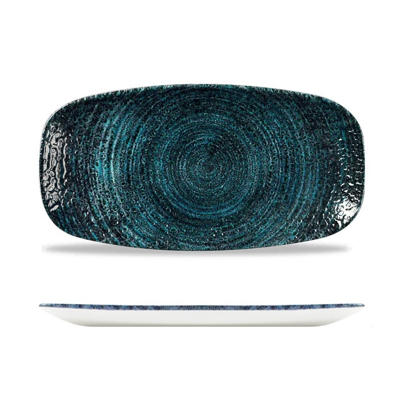 Design che si distingue per l’elegante motivo concentrico ispirato alla ceramica tornita a mano, arricchito da sfumature che spaziano dal blu al verde intenso, evocando le profondità marine con un affascinante gioco di riflessi e tonalità. Questa combinazione cromatica raffinata impreziosisce la presentazione di colazioni, antipasti, primi, secondi, contorni o come centrotavola, donando a ogni mise en place calore e raffinatezza.