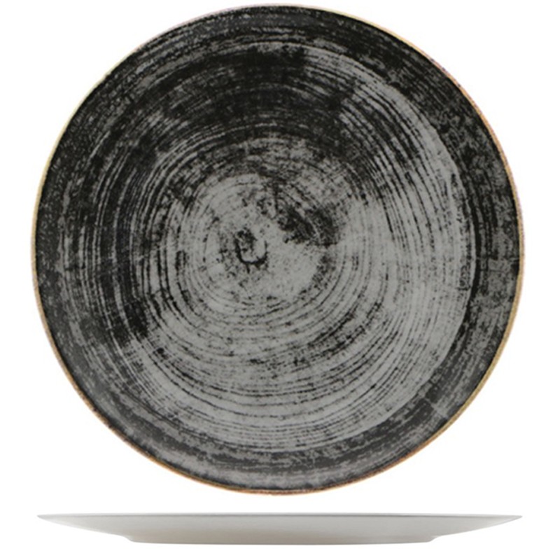 Il piatto pizza della linea Black round firmato Saturnia è un vero gioiello di design che unisce eleganza e raffinatezza, trasformando ogni portata in una presentazione scenografica. Un design raffinato che diventa protagonista della tavola, grazie alle sfumature interne in nero, bianco e grigio con un suggestivo effetto graffiato e sfumato. A completare il tutto, il bordo marroncino-dorato che dona calore e un tocco di pregio artigianale.