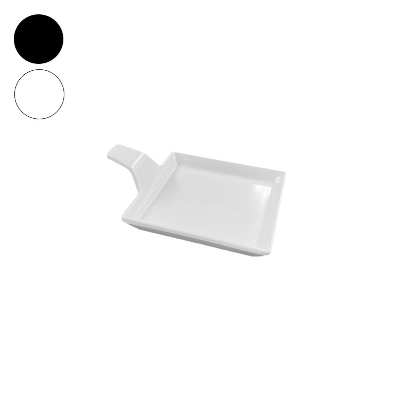 Elegante, funzionale e pratico, questo piattino monoporzione in melamina con manico è ideale per servire antipasti, mini dessert, dolcetti e finger food in modo ordinato e raffinato.