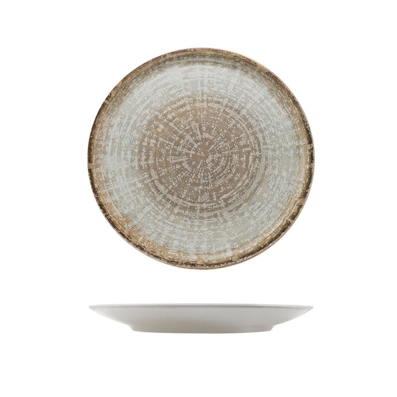 Carattere deciso ed eleganza contemporanea definiscono il piatto dessert Crete di Saturnia. Un design raffinato che diventa protagonista della tavola, grazie alla trama irregolare e naturale, con sfumature che spaziano dal marrone chiaro al marrone più intenso, con tocchi di grigio e bianco. A completare il tutto, il bordo marroncino-dorato che dona calore e un tocco di pregio artigianale.
