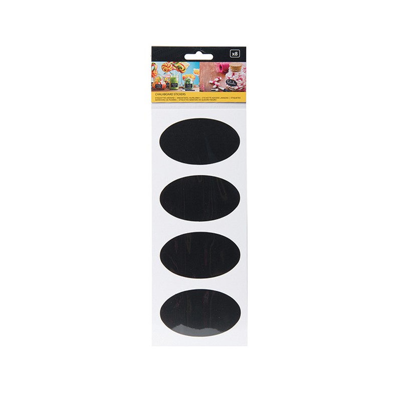 Etichette nere adesive a forma ovale, scrivibili con pennarello a gesso liquido e facilmente cancellabili con un panno umido.