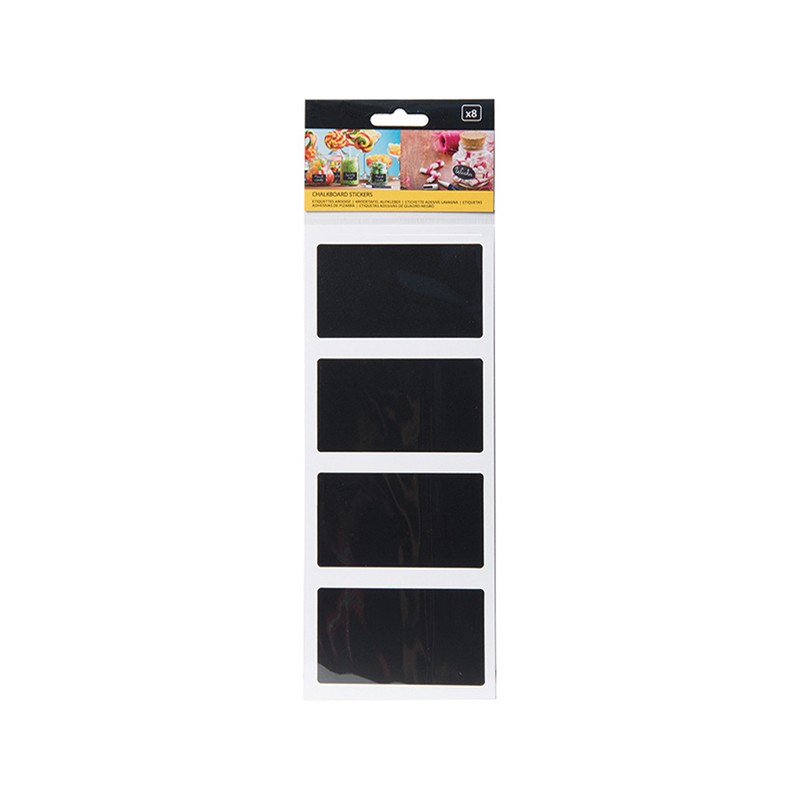 Etichette nere adesive a forma rettangolare, scrivibili con pennarello a gesso liquido e facilmente cancellabili con un panno umido.