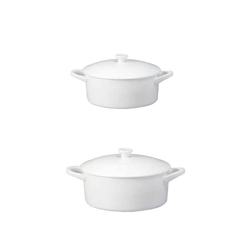 Realizzata in porcellana, è dotata di manici laterali che facilitano il trasporto e di un pratico coperchio con pomello per una presa sicura. Disponibile in due formati, si adatta a ogni esigenza di servizio o presentazione.