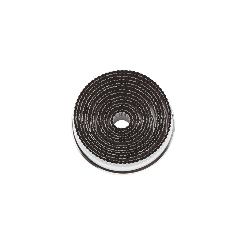 Il set include 14 tagliapasta tondi festonati, con diametri che variano da Ø 2 a Ø 12 cm, offrendo massima versatilità per ogni esigenza di lavorazione.