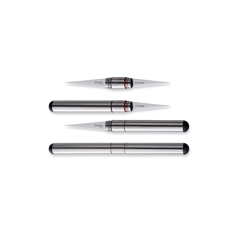 Questo stiletto a profilo triangolare integra due lame differenti in un unico strumento, permettendo di affrontare lavorazioni diverse senza cambiare utensile. La lama flessibile, caratterizzata da un taglio convesso, è altamente elastica e ritorna sempre alla sua linea retta originale, risultando ideale per incisioni leggere, curve e dettagli decorativi. La lama rigida, invece, offre la resistenza necessaria per intagliare con precisione anche verdure e frutti dalla buccia dura, come zucca e melone.