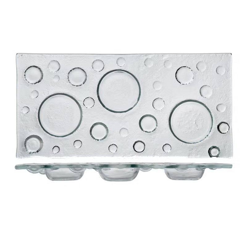 Realizzata in vetro trasparente temprato, si distingue per la presenza di tre pratici scomparti e un raffinato decoro a bolle che dona movimento e originalità alla superficie.