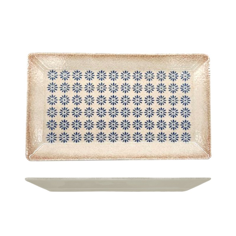 Il vassoio rettangolare della linea Kimi firmata Saturnia è una scelta elegante e raffinata, pensata per arricchire la tavola con un tocco di tradizione e personalità. Il suo design si distingue per il colore crema chiaro, impreziosito da un bordo più scuro effetto “bruciato” che richiama uno stile rustico. Al centro spicca un delicato motivo floreale blu scuro, in grado di donare un carattere unico e un fascino classico a ogni mise en place.
